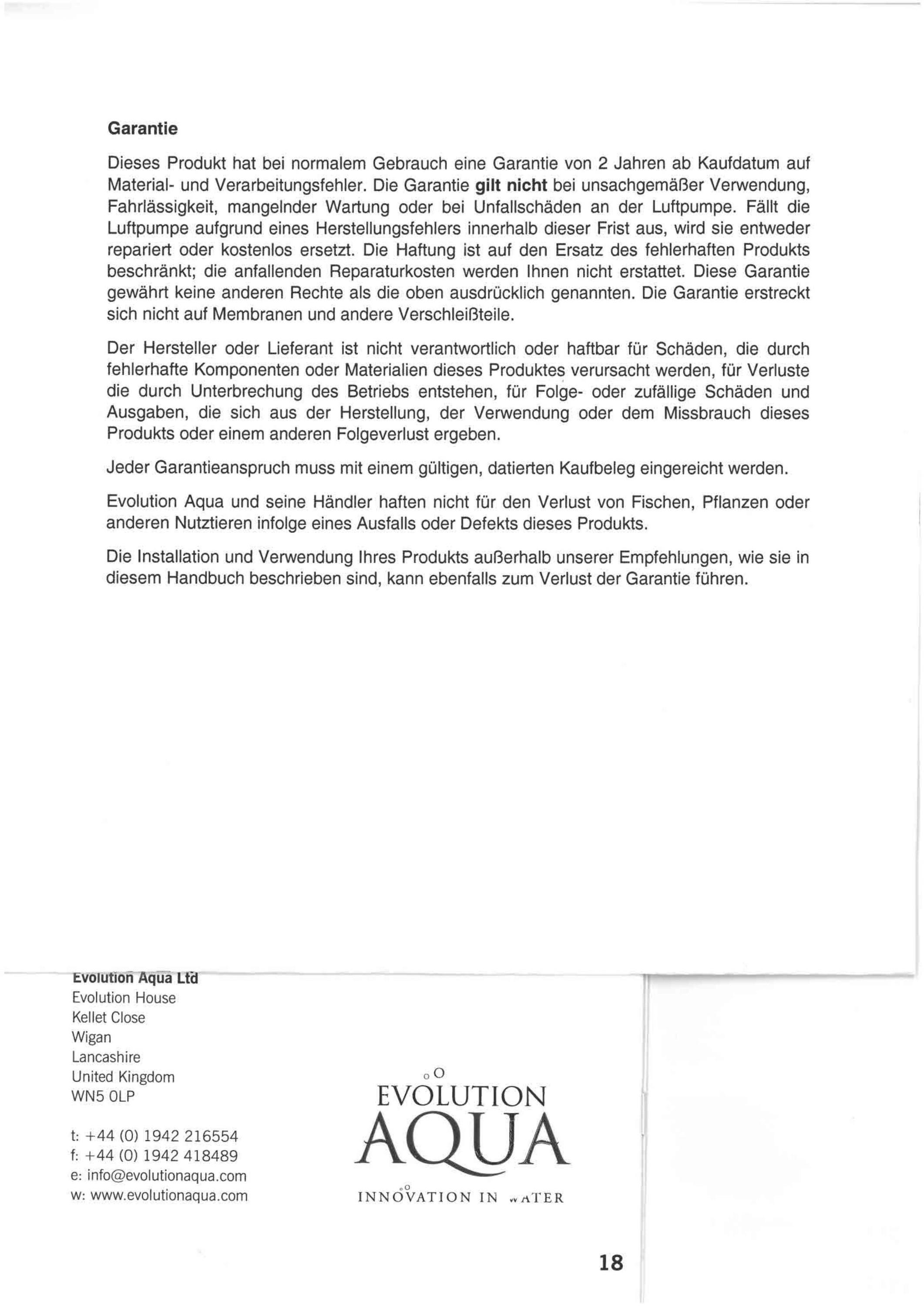 Dieses Produkt hat bei normalem Gebrauch eine Garantie von 2 Jahren ab Kaufdatum auf Material- und Verarbeitungsfehler. Die Garantie gilt nicht bei unsachgemäßer Verwendung, Fahrlässigkeit, mangelnder Wartung oder bei Unfallschäden an der Luftpumpe. Fällt die Luftpumpe aufgrund eines Herstellungsfehlers innerhalb dieser Frist aus, wird sie entweder repariert oder kostenlos ersetzt. Die Haftung ist auf den Ersatz des fehlerhaften Produkts beschränkt; die anfallenden Reparaturkosten werden Ihnen nicht erstattet. Diese Garantie gewährt keine anderen Rechte als die oben ausdrücklich genannten. Die Garantie erstreckt sich nicht auf Membranen und andere Verschleißteile. Der Hersteller oder Lieferant ist nicht verantwortlich oder haftbar für Schäden, die durch fehlerhafte Komponenten oder Materialien dieses Produktes verursacht werden, für Verluste die durch Unterbrechung des Betriebs entstehen, für Folge- oder zufällige Schäden und Ausgaben, die sich aus der Herstellung, der Verwendung oder dem Missbrauch dieses Produkts oder einem anderen Folgeverlust ergeben. Jeder Garantieanspruch muss mit einem gültigen, datierten Kaufbeleg eingereicht werden. Evolution Aqua und seine Händler haften nicht für den Verlust von Fischen, Pflanzen oder anderen Nutztieren infolge eines Ausfalls oder Defekts dieses Produkts. Die Installation und Verwendung Ihres Produkts außerhalb unserer Empfehlungen, wie sie in diesem Handbuch beschrieben sind, kann ebenfalls zum Verlust der Garantie führen.