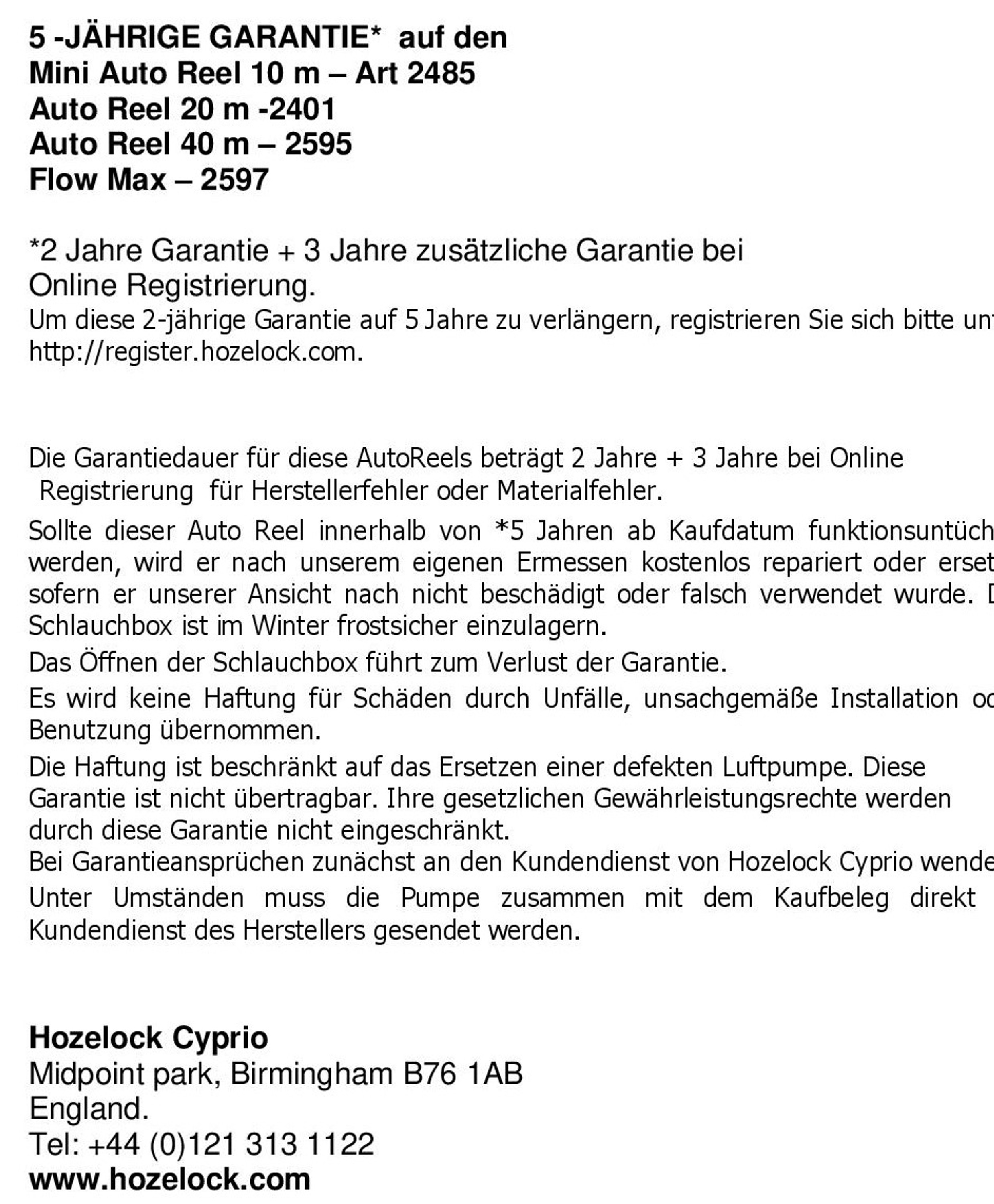 Um diese 2-jährige Garantie auf 5 Jahre zu verlängern, registrieren Sie sich bitte unter http://register.hozelock.com.Die Garantiedauer für diese AutoReels beträgt 2 Jahre + 3 Jahre bei Online Registrierung für Herstellerfehler oder Materialfehler.
