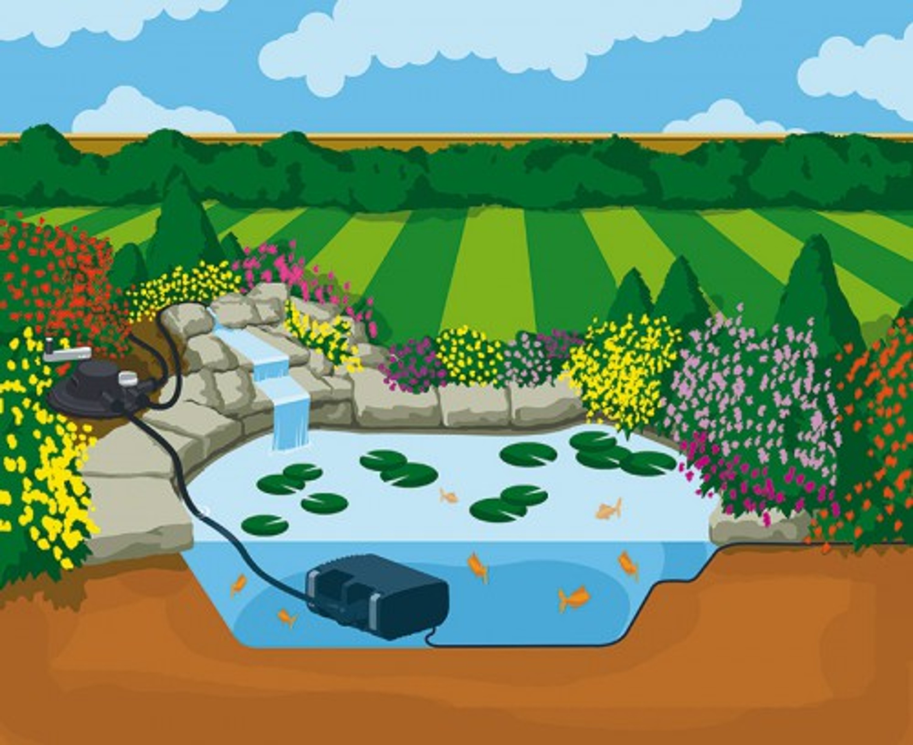 Der Bioforce lässt sich leicht installieren, und kann an der Seite des Teiches versteckt oder in der Erde bis zur Höhe des Filtereinlaufs vergraben werden. Der druckdichte Filter kann das Wasser an einen höheren Punkt pumpen und sorgt somit zusätzlich für die Speisung eines Wasserfalls.