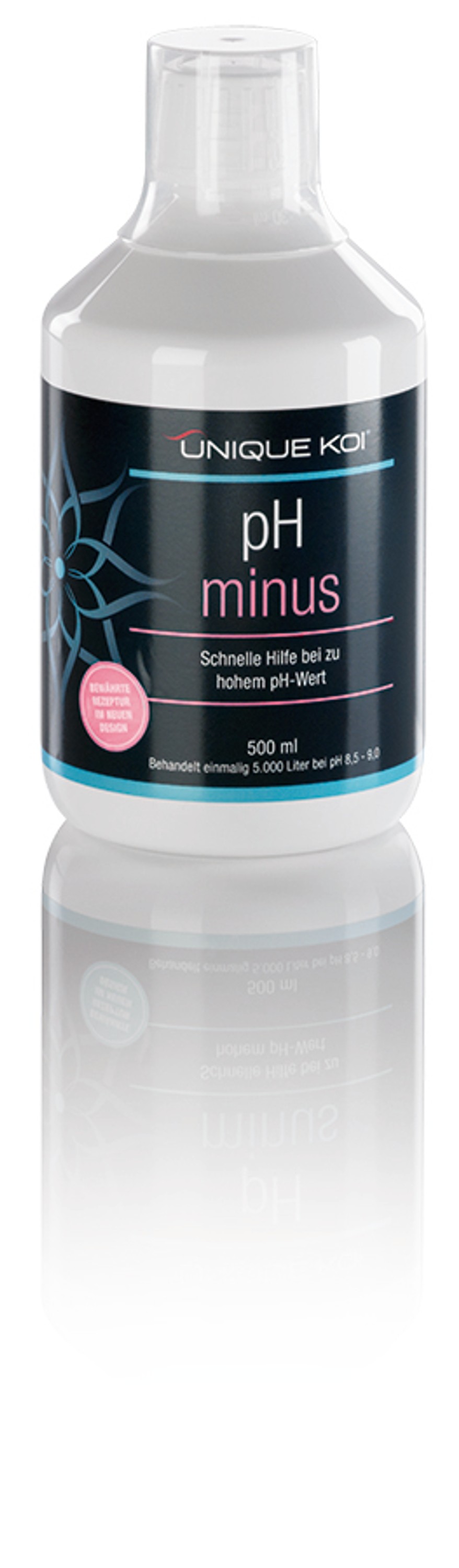 Der pH-Wert gibt den Säuregehalt des Teichwassers an. Bei Teichen mit Fischbesatz liegt dieser Wert optimalerweise zwischen pH 7 - 8. Fische können durch einen zu hohen pH-Wert ein apathisches Verhalten zeigen. Außerdem kann dieser zu einer Ammoniak-Vergiftung bei den Tieren führen. Ein pH-Wert von 8,0 ist 10 mal alkalischer (basischer) als ein pH-Wert von 7,0. Ein pH-Wert von 9,0 ist 100 mal alkalischer als ein pH-Wert von 7,0. Deshalb benötigt man bei gleichem Teichvolumen proportional mehr pH Minus, um einen pH-Wert von 9,0 zu senken, als bei einem pH-Wert von 8,0.
